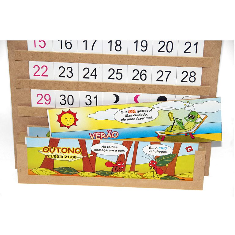 Base  medindo 45 x 30 cm serigrafada os dias da semana contém 6 suportes de encaixe de correr  para fixar as peças referentes aos dias do mês, as quatro fases da lua  o mês e ano vigente.