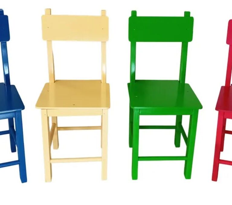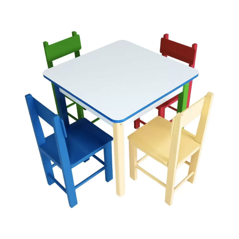 Kit Completo: Este conjunto inclui quatro cadeiras, permitindo que um grupo de crianças compartilhe o espaço ao redor da mesa. As cadeiras estão disponíveis em quatro cores: verde, vermelha, amarela e azul, o que torna a experiência ainda mais alegre e personalizada.