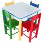 Cores Vibrantes: Os pés da mesa e o suporte das cadeiras são coloridos e pintados com tinta atóxica. As cores incluem vermelho, verde, azul e amarelo, tornando o conjunto visualmente atraente para as crianças.