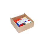 18 placas medindo 7,5 x 7,5 cm e 45 cilindros de madeira pintados medindo 3,5 cm de altura, pintados com tinta atóxica nas cores: